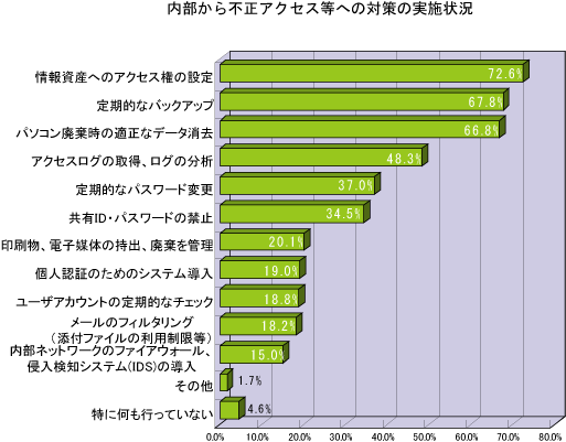 内部からの不正アクセス等への対策については、「特に何も行っていない」という回答は4.6%と低い割合になっており、多くの事業体においてなんらかの対策を取っていることがわかります。中でも一番割合が高かったのは「情報資産へのアクセス権の設定」となっています。