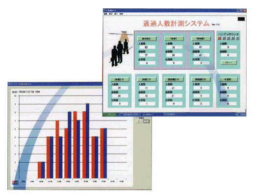◎入店者、来場者の人数カウント ◎方向別にカウント ◎身長別に2種類のカウントを設定 ◎外乱の影響が少ない ◎並列、縦列、交差、蛇行等による誤検出がされにくい ※密着した場合はこの限りではありません ◎ネットワーク接続にて全国チェーンの店舗等でも瞬時にリアルタイムのデータが確認できます ◎ケータイ、サーバとの連動で、移動中の確認も可能